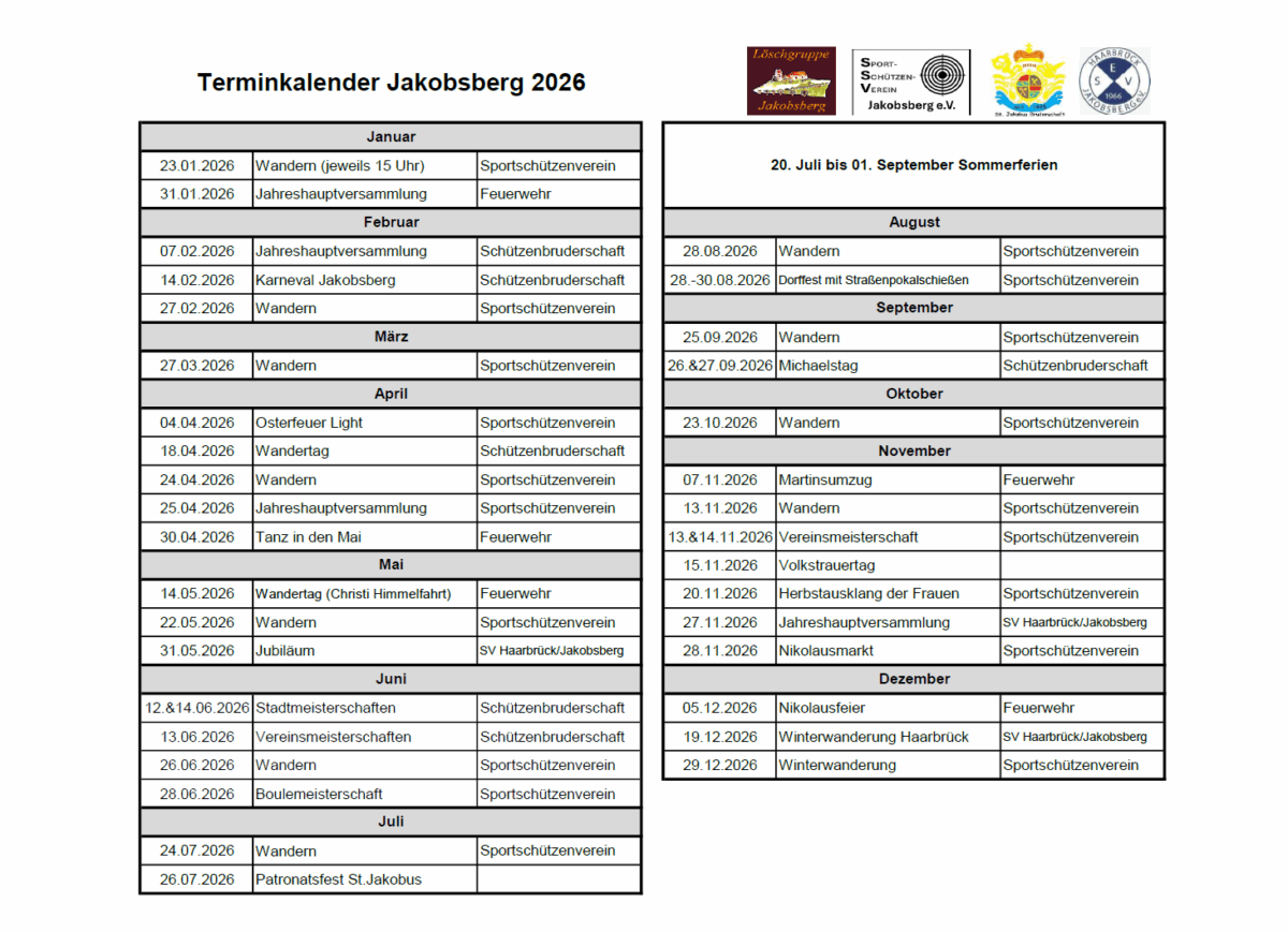 Terminkalender Jakobsberg 2026